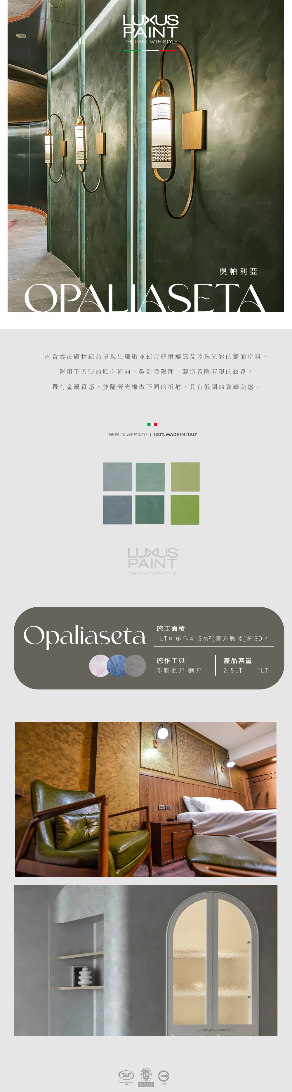 LUXUS PAINT義大利奧帕利亞藝術漆,藝術漆通過歐洲必維國際ISO認證、檢驗無毒無重金屬環保材質內含雲母礦物結晶可讓牆面擁有絲絨觸感與珍珠光彩,且運用不同的手法,製造陰陽面,讓裝飾風格豐富多樣化且可利用漆類特性製作成擁有3D立體感牆面,是居家、辦公室、商業空間呈現個人美學的最佳選擇隔絕性良好,後續維護可使用中性清潔劑或清水擦拭。