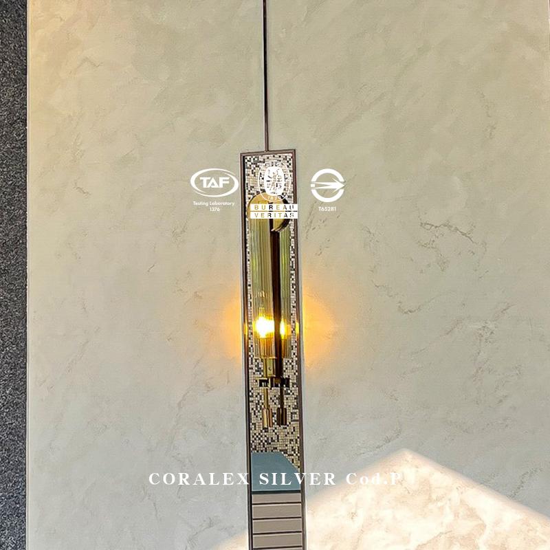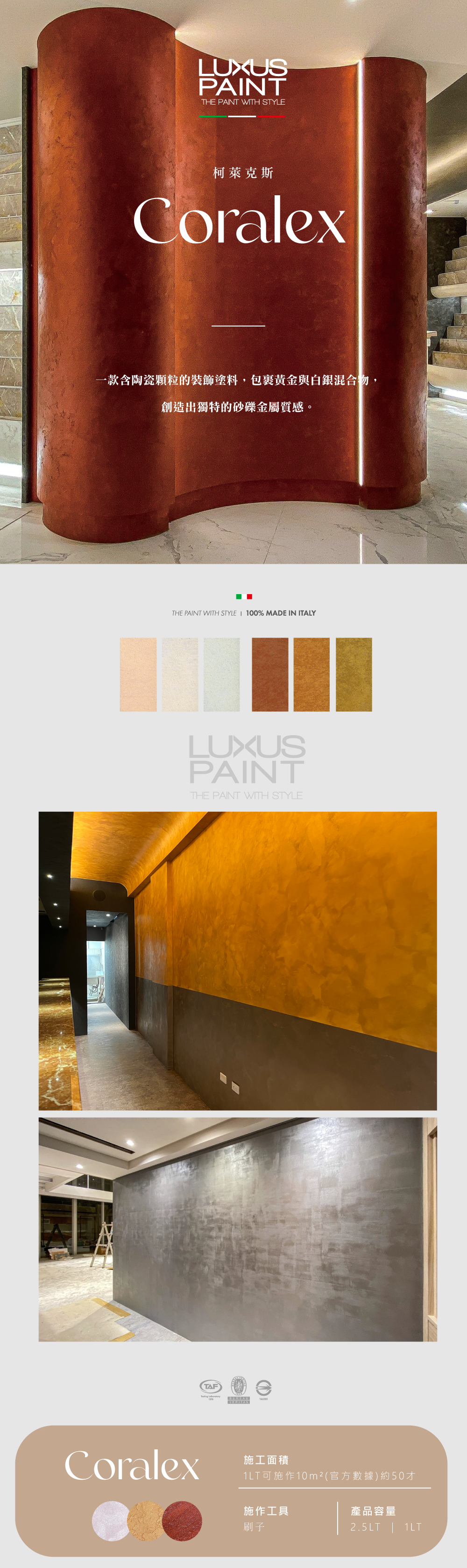 一款含陶瓷顆粒的裝飾塗料,包裹黃金與白銀混合物,創造出獨特的砂礫金屬質感。-1.健康維護——無毒低甲醛2.合格證書◎歐盟必維--BV◎台灣塗料工會--TAF◎標檢檢驗局--BSMI T652813.最能符合設計師設計的需求,沒有形狀及材質的限制。