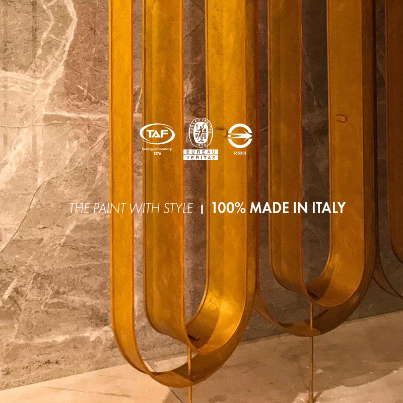 一款含陶瓷顆粒的裝飾塗料,包裹黃金與白銀混合物,創造出獨特的沙碩金屬質感
