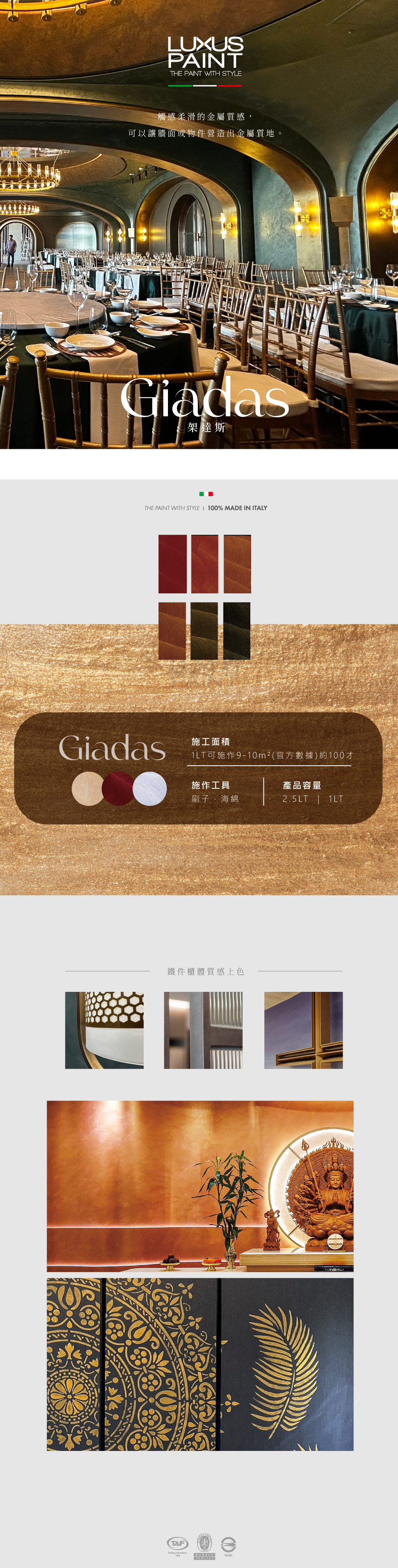 觸感柔滑的金屬質感,可以讓牆面或物件營造出金屬質地。-1.健康維護——無毒低甲醛2.合格證書◎歐盟必維--BV◎台灣塗料工會--TAF◎標檢檢驗局--BSMI T652813.最能符合設計師設計的需求,沒有形狀及材質的限制。